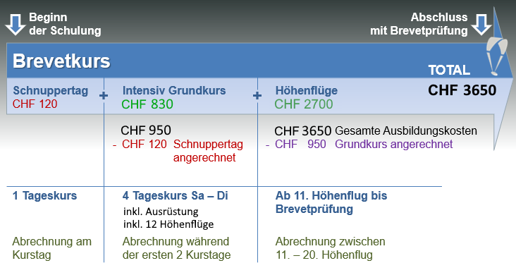Das umfassende Kursangebot richtet sich nach den verschiedenen Anfragen unserer Kunden. Gleitschirmfliegen ist sicher eine der kostengünstigsten Flugsportarten die es gibt. Aber auch diese hat ihren Preis. Die Ausbildung und das Material sind die hauptsächlichen Kosten die es zu berücksichtigen gilt. Die Entscheidung diesen Sport zu erlernen und nach Abschluss des Brevets aktiv und regelmässig auszuüben, wird oft erst nach den ersten Schulungstagen definitiv getroffen. Aus diesem Grund bieten wir die Ausbildung bis zum Piloten in drei Stufen an. Zuerst kommt der Schnuppertag, dann ein Grundkurs und wenn du als Schüler aufgrund der gemachten Erfahrungen festgestellt hast, dass dir der Sport gefällt, ziehst du die Ausbildung bis zum Brevet weiter. Weisst du schon, dass du brevetierter Pilot werden möchtest, ist der Brevetkurs das Richtige Paket für dich.