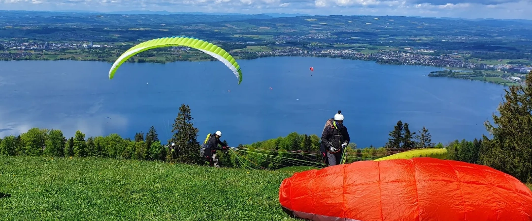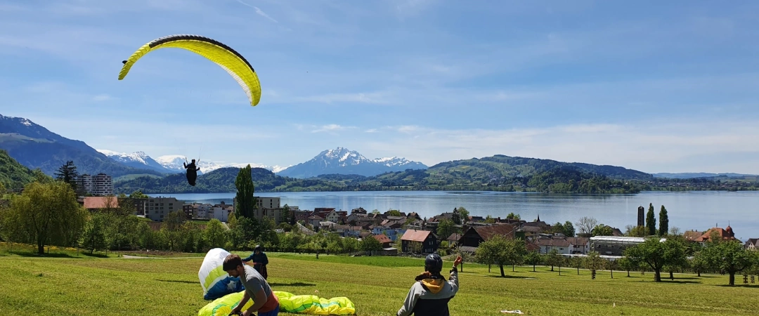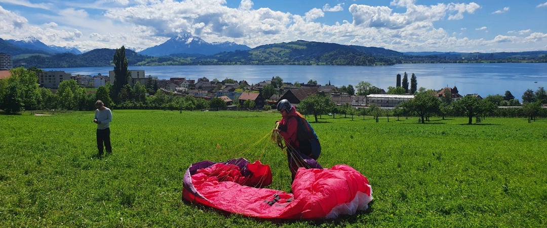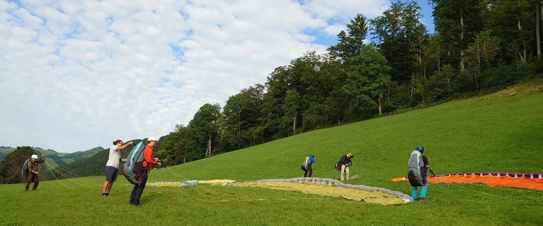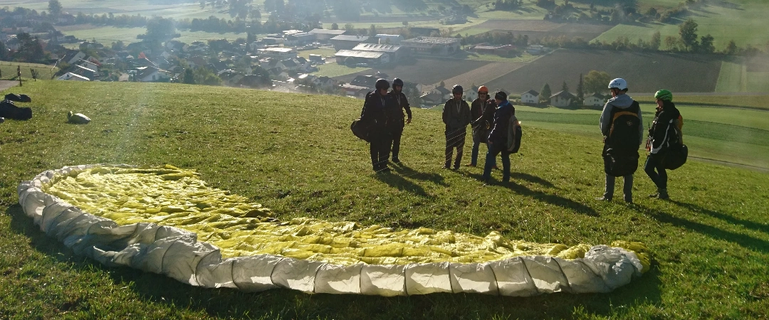 Gleitschirmfliegen ist einfach...etwas anspruchsvoller ist der Startablauf. Anders als bei den meisten Fluggeräten, hat der Gleitschirm keine feste Struktur sondern ist nur ein "Stück Tuch". Als Piloten müssen wir nun den Gleitschirm durch richtiges Hochführen, Stabilisieren und Korrigieren in die Luft bringen. Die Schwierigkeit liegt in der Koordination dieser einzelnen, an sich einfachen Bewegungen. Somit ist das Hauptthema bei allen Übungen am Schulungshügel der Start mit all seinen einzelnen Phasen. Dank der modernen Gleitschirme die dir als Schüler zu Verfügung stehen, machst du in kurzer Zeit Fortschritte und wirst bereits am ersten Tag für kurze Gleitflüge abheben. Nach 2-3 Tagen am Übungshang bist du "reif" für den ersten Höhenflug! Starten - Abheben - Fliegen! Ein super Gefühl, dass dir immer in Erinnerung bleiben wird.